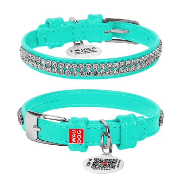 Нашийник для собак шкіряний WAUDOG з QR паспортом "Полотно стрази", Ш 9 мм, Довжина 19-25 см ментоловий