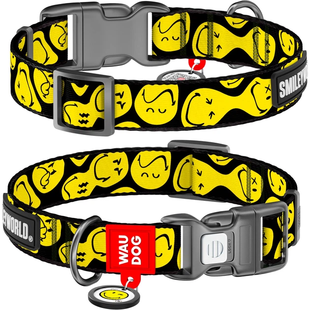 Нашийник для собак нейлоновий WAUDOG Nylon «Смайли на чорному», з QR-паспортом, пластиковий фастекс, регульований, XL (ширин