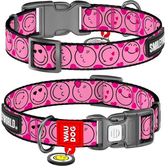 Нашийник для собак WAUDOG Nylon «Смайли на рожевому», нейлоновий, з QR-паспортом, пластиковий фастекс, XL (довжина 37–58 см,