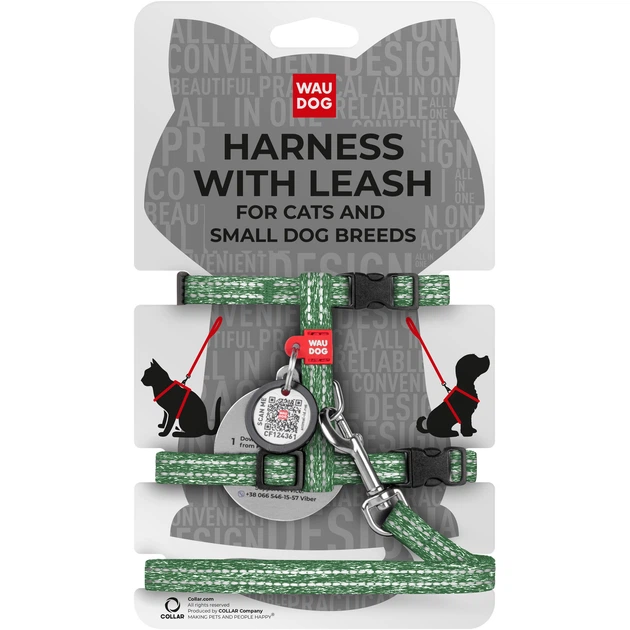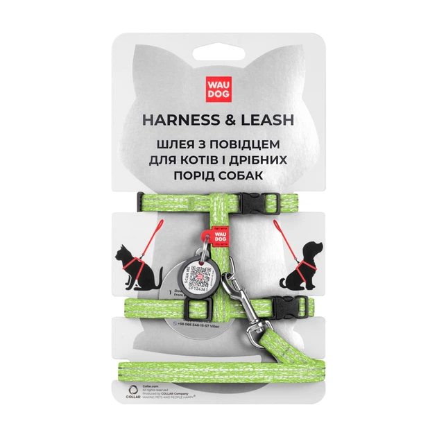 Шлея з повідцем для котів WAUDOG Re-cotton з QR паспортом, з відновленої бавовни, світловідбиваюча, пластиковий фастекс, роз