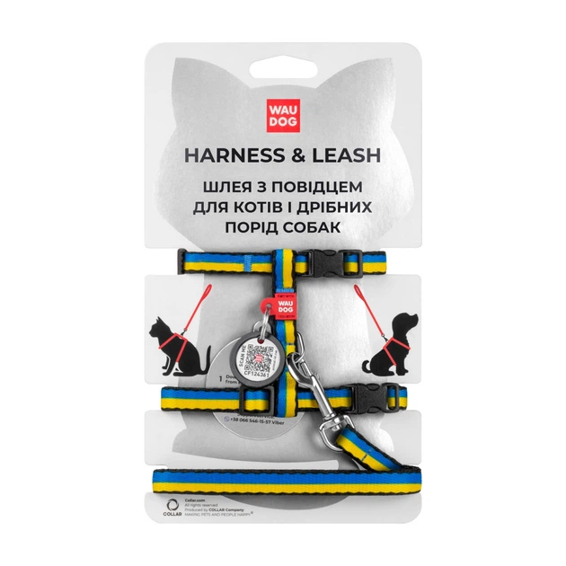 Шлей з поводком для котів WAUDOG Nylon з QR паспортом Colors of freedom XS Ш 10 мм В 25-40 см З 20-30 см Жовто-блакитний (55