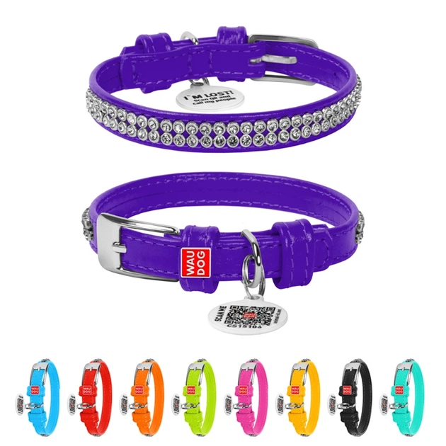 Ошейник для собак шкіряний WAUDOG Glamour з QR паспортом, з прикрасою "Полотно стрази", XXS, Ш 9 мм, Дов 18-21 см фіолетовий