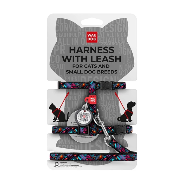 Шлея з повідцем для котів WAUDOG Nylon з QR паспортом малюнок "Colors of freedom" пластиковий фастекс XS Ш 10 мм В 25-40 см