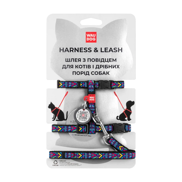 Шлея з повідцем для котів WAUDOG Nylon c QR паспортом, малюнок "Інді", пластиковий фастекс, Ш 10 мм, 25-40 см, З 20-30 см