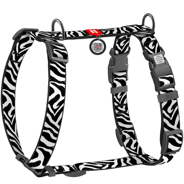 Шлей для собак анатомічний H-подібний WAUDOG Nylon з QR-паспортом, малюнок "Зебра", пластиковий фастекс, S, Ш 15 мм, A 30-45