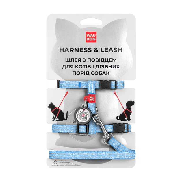 Шлея з повідцем для котів WAUDOG Re-cotton з QR паспортом, з відновленої бавовни, світловідбиваюча, пластиковий фастекс, роз