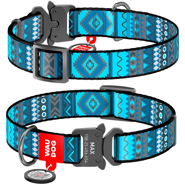 Нейлоновий нашийник для собак WAUDOG Nylon з QR паспортом, з малюнком "Етно синій", металева пряжка-фастекс з майданчиком дл