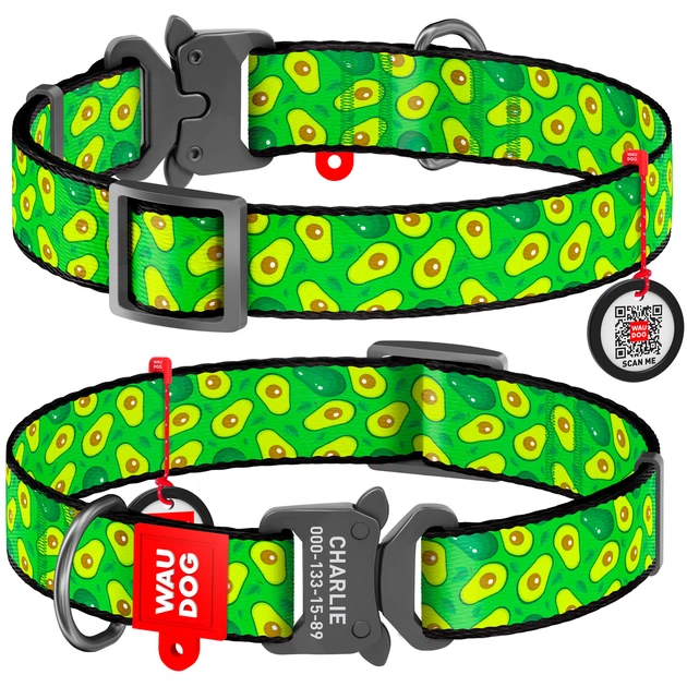 Нейлоновий нашийник для собак WAUDOG Nylon з QR паспортом, з малюнком "Авокадо", металева пряжка-фастекс із майданчиком для