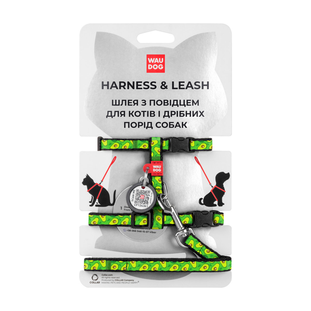 Шлея з повідцем WAUDOG Nylon з QR паспортом малюнок "Авокадо" пластиковий фастекс Ш 10 мм 25-40 см С 20-30 см