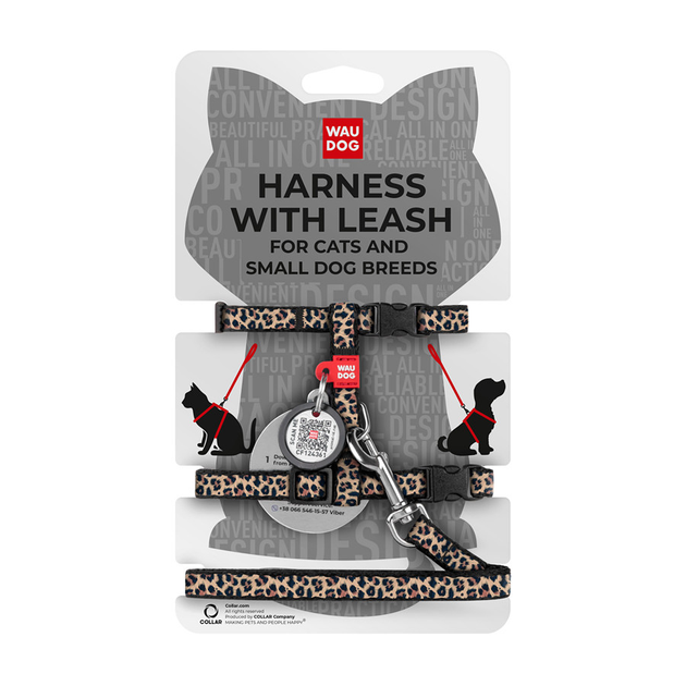 Шлея з повідцем для котів та дрібних порід собак WAUDOG Nylon з QR паспортом, малюнок "Леопард", пластиковий