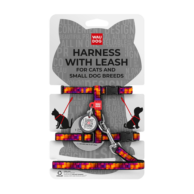 Шлея з повідцем для котів та дрібних порід собак WAUDOG Nylon з QR паспортом, малюнок "Куби 3Д", пластиковий