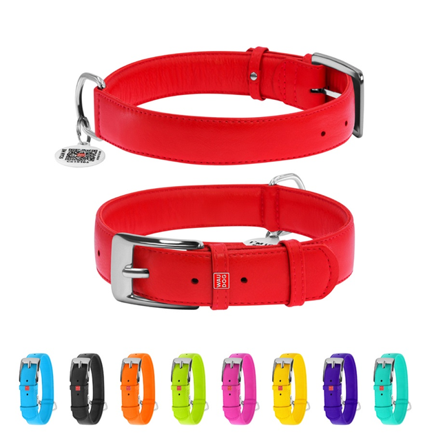 Ошейник для собак шкіряний WAUDOG Glamour з QR паспортом, без прикрас, XL, Ш 35 мм, Дов 46-60 см червоний