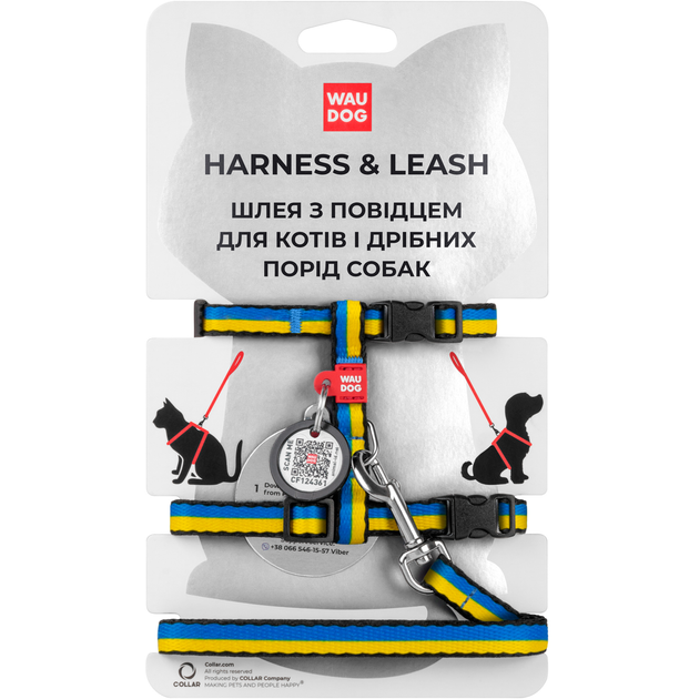 Шлея з повідцем для котів і дрібних порід собак WAUDOG Nylon з QR паспортом, малюнок "Colors of freedom", пластиковий фастек