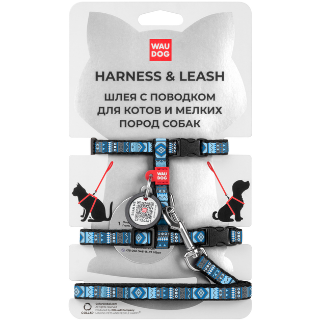 Нейлонова шлея з повідцем WAUDOG Nylon з QR паспортом, з малюнком «Етно синій» для котів та дрібних собак 122 см 10 мм (5480