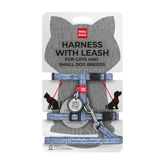 Нашийники, повідки, шлеї Collar WAUDOG Re-cotton Шлея з повідцем для котів з QR паспортом, з відновленої бавовни, блакитний