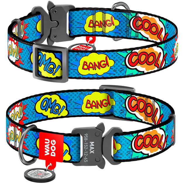 Нейлоновий нашийник для собак WAUDOG Nylon з QR паспортом, з малюнком "ВАУ", металева пряжка-фастекс із майданчиком для грав