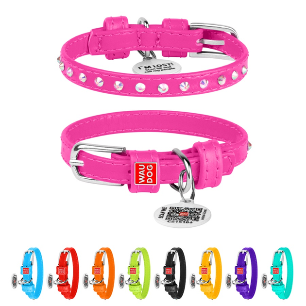 Ошейник для собак шкіряний WAUDOG Glamour з QR паспортом, з клейовими стразами, Ш 9 мм, Дов 19-25 см рожевий