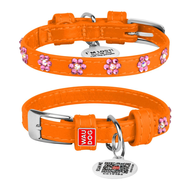 Нашийник для собак шкіряний WAUDOG з QR паспортом "Квіти", Ш 9 мм, Довжина 19-25 см оранжевий