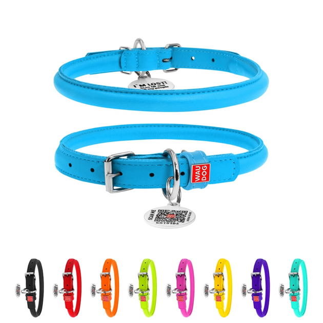 Нашийник для собак шкіряний WAUDOG Glamour з QR паспортом, круглий, Д 10 мм, Дл 33-41 см блакитний