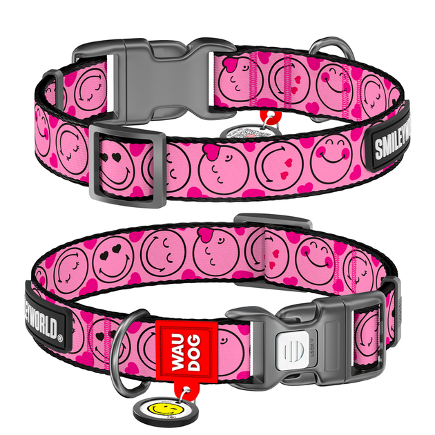 Нейлоновий нашийник для собак WAUDOG Nylon c QR-паспортом малюнок Смайли на рожевому пластиковий фастекс XL Ш 25 мм Д 37-58