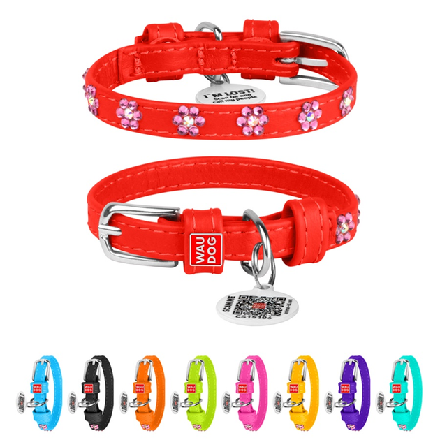 Ошейник для собак шкіряний WAUDOG Glamour з QR паспортом, з клейовими стразами "Квіти", Ш 9 мм, Дов 19-25 см червоний