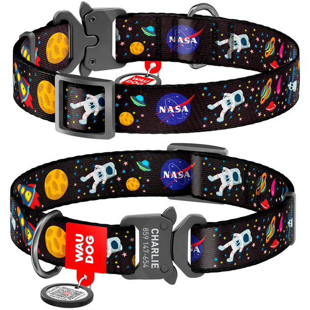 Нейлоновий нашийник для собак WAUDOG Nylon з QR паспортом, з малюнком "NASA", металева пряжка-фастекс із майданчиком для гра