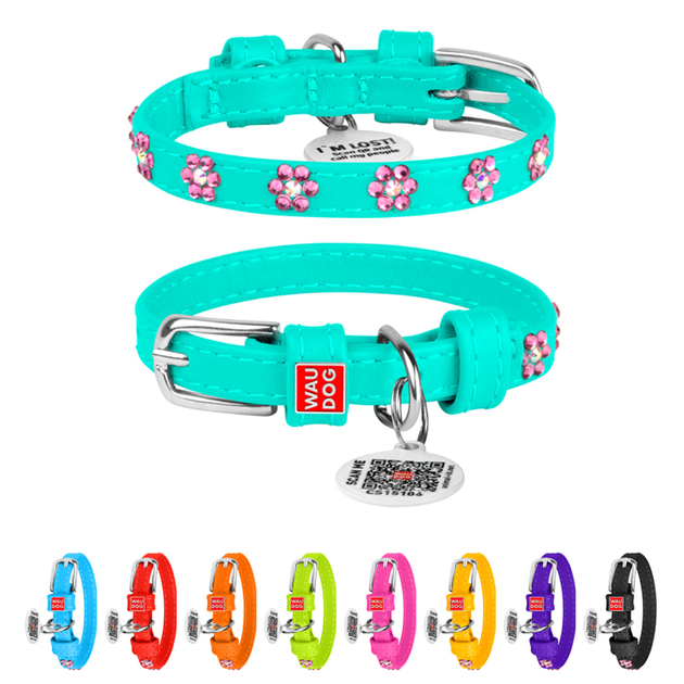 Нашийник для собак шкіряний WAUDOG Glamour з QR паспортом, з клейовими стразами "Квіти", Ш 9 мм, Дов 19-25 см ментоловий