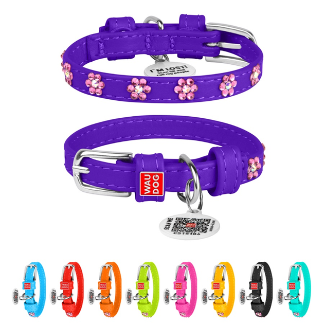 Ошейник для собак шкіряний WAUDOG Glamour з QR паспортом, з клейовими стразами "Квіти", Ш 9 мм, Дов 19-25 см фіолетовий