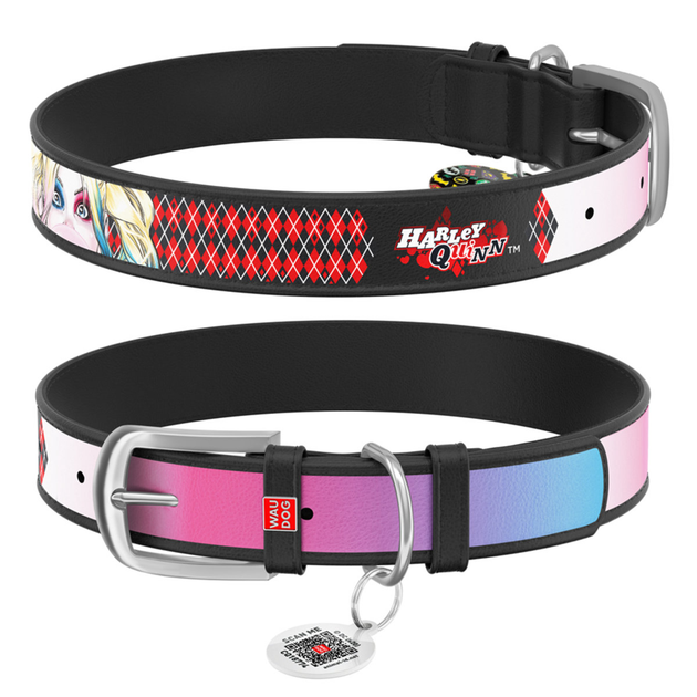 Нашийник для собак шкіряний WAUDOG Design з QR паспортом, малюнок "Харлі Квін", Ш 15 мм, Дл 26-35 см, чорний