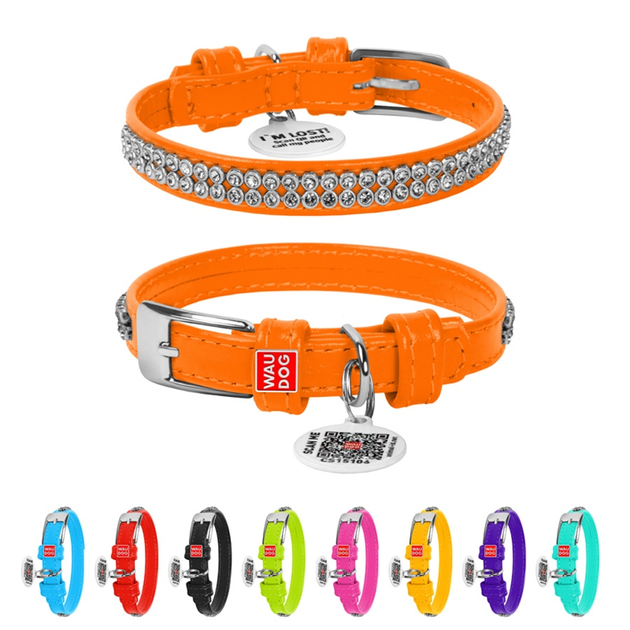 Ошейник для собак шкіряний WAUDOG Glamour з QR паспортом, з прикрасою "Полотно стрази", XS, Ш 12 мм, Дов 21-29 см помаранчев