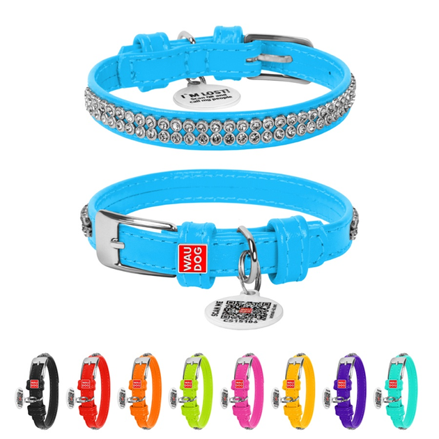 Ошейник для собак шкіряний WAUDOG Glamour з QR паспортом, з прикрасою "Полотно стрази", XS, Ш 12 мм, Дов 21-29 см блакитний