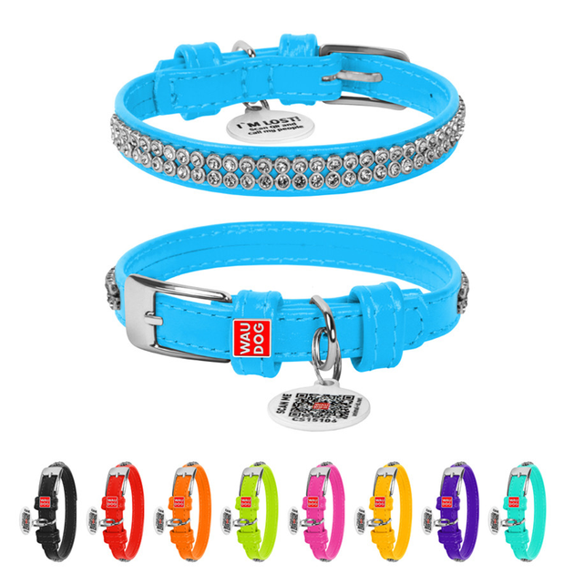 Нашийник для собак шкіряний WAUDOG Glamour з QR паспортом, з клейовими стразами, Ш 12 мм, Дов 21-29 см блакитний