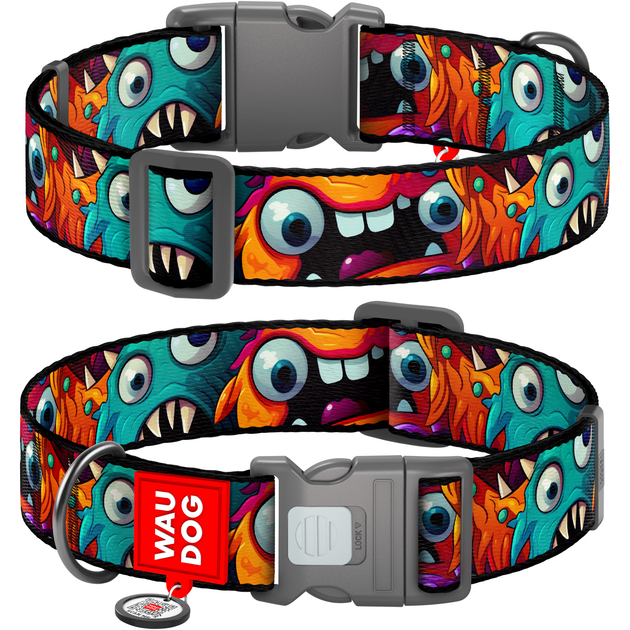 Нашийник для собак нейлоновий WAUDOG Nylon з QR паспортом, малюнок "Зубасті монстри", пластиковий фастекс, розмір XXL, 46-70