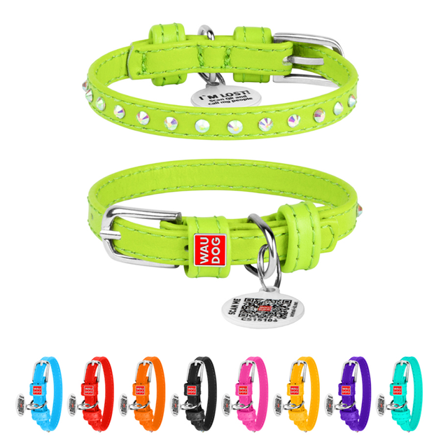 Нашийник для собак шкіряний WAUDOG Glamour з QR паспортом, з клейовими стразами, Ш 9 мм, Д 18-21 см, салатовий