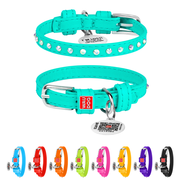 Нашийник для собак шкіряний WAUDOG Glamour з QR паспортом, з клейовими стразами, Ш 9 мм, Д 18-21 см, ментоловий