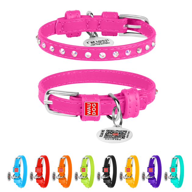 Нашийник для собак шкіряний WAUDOG Glamour з QR паспортом, з клейовими стразами, Ш 9 мм, Д 18-21 см, рожевий