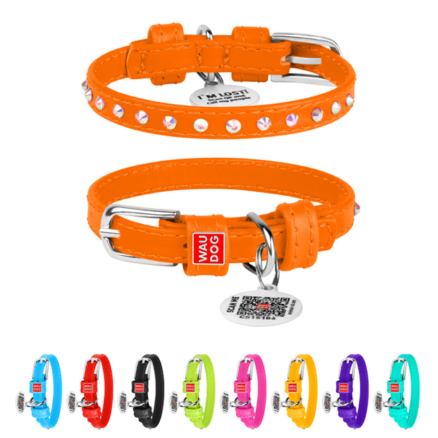 Нашийник для собак шкіряний WAUDOG Glamour з QR паспортом, з клейовими стразами, Ш 9 мм, Д 18-21 см, оранжевий