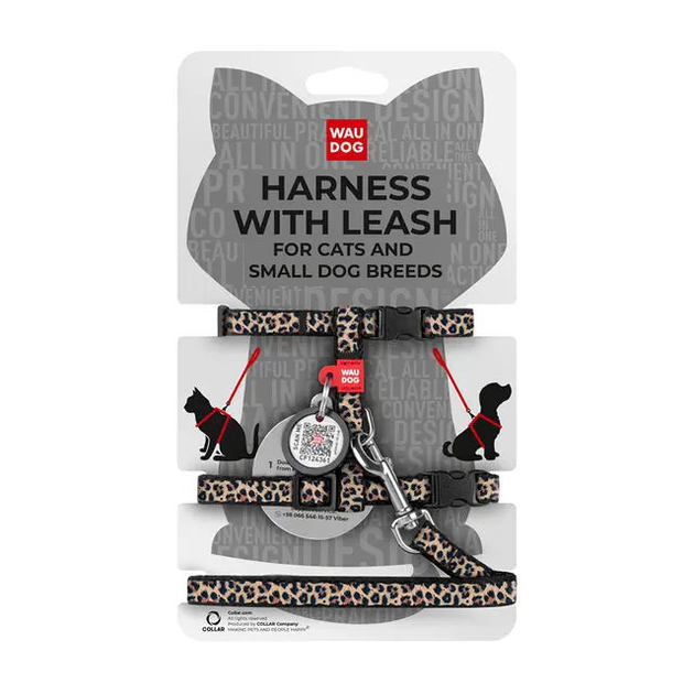 Шлея з повідцем для котів та дрібних порід собак WAUDOG Nylon з QR паспортом, малюнок 'Леопард', пластиковий фастекс, XS, Ш