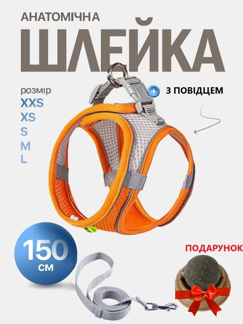 Шлейка з повідцем для котів та собак дрібних та середніх порід Розмір XS Жовтогарячий М'ята у подарунок