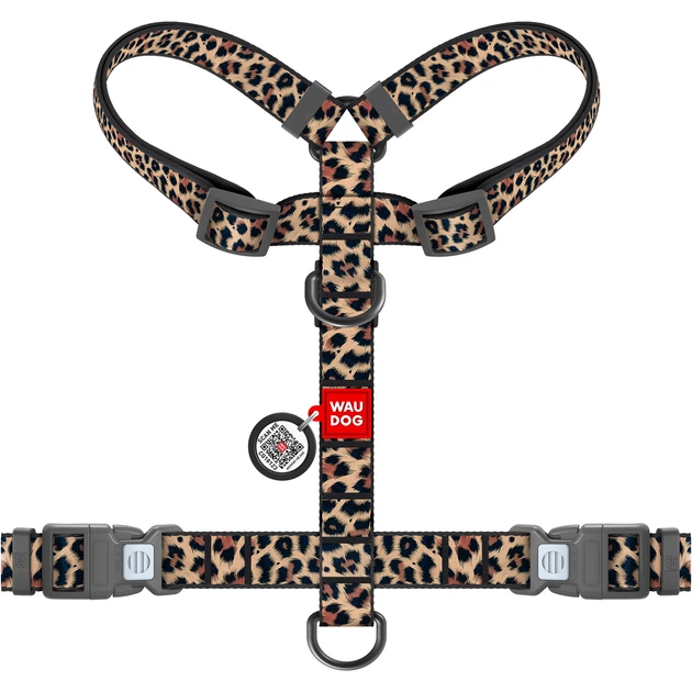 Шлея для собак анатомічна H-подібна WAUDOG Nylon з QR-паспортом, малюнок "Леопард", з двома фастексами, розмір L