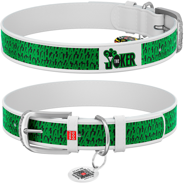 Шкіряний нашийник для собак WAUDOG Design з QR паспортом, малюнок "Джокер", металева пряжка Білий 29-38 см 20 мм (0020-1001-
