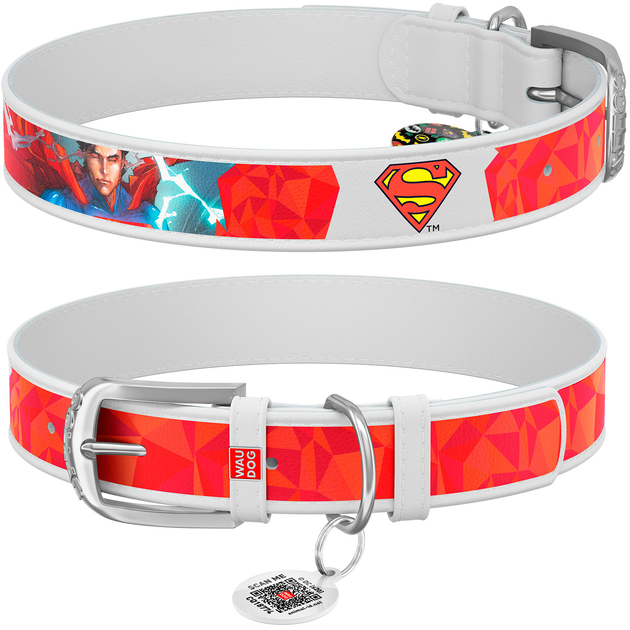 Шкіряний нашийник для собак WAUDOG Design з QR паспортом, малюнок "Супермен1", металева пряжка Білий 29-38 см 20 мм (0020-10