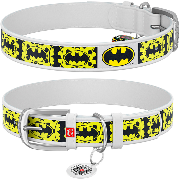 Шкіряний нашийник для собак WAUDOG Design з QR паспортом, малюнок "Бетмен4", металева пряжка Білий 29-38 см 20 мм (0020-1006