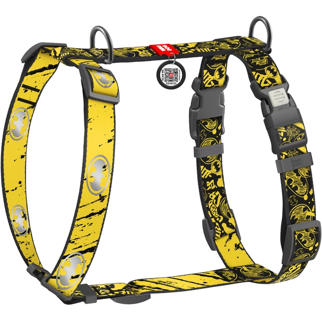 Шлея для собак анатомічна H-подібна WAUDOG Nylon з QR-паспортом, світловідбивна, малюнок "Бетмен Ескіз", пластиковий фастекс