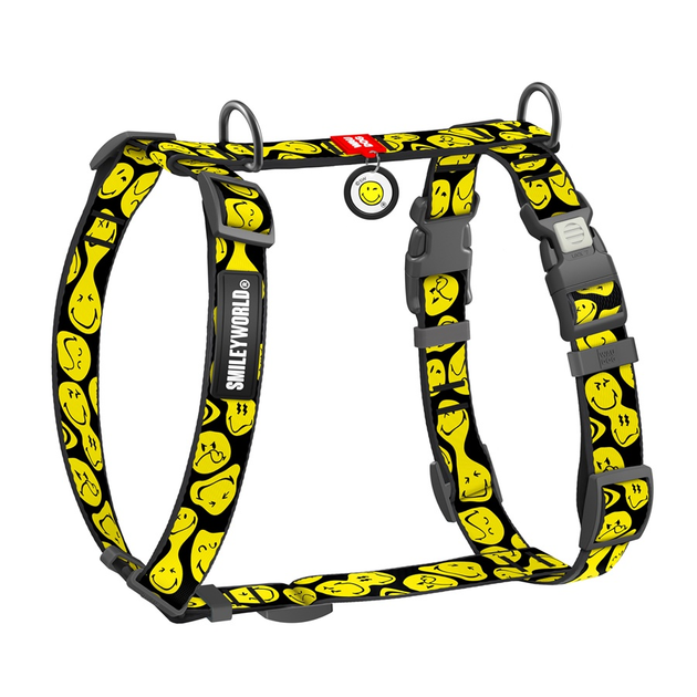 Шлей для собак анатомічний H-подібний WAUDOG Nylon з QR-паспортом, малюнок "Смайли на чорному", пластиковий фастекс, S, Ш 15