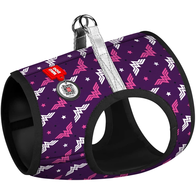 Шлея для собак м'яка WAUDOG Clothes з QR паспортом, малюнок «Чудо-жінка фіолет», XS3, B 32-35 см, C 22-24 с