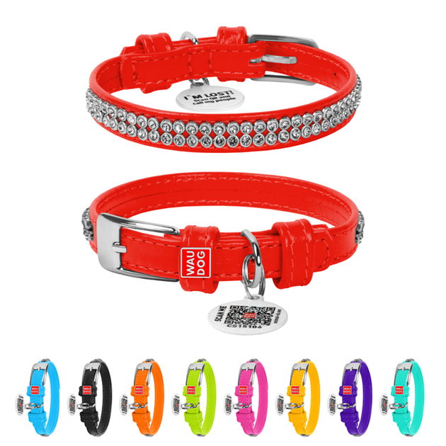 Нашийник для собак WAUDOG шкіряний Glamour з QR паспортом, з прикрасою Полотно стрази, XS, Ш 12 мм, Д 21-29 см, червоний