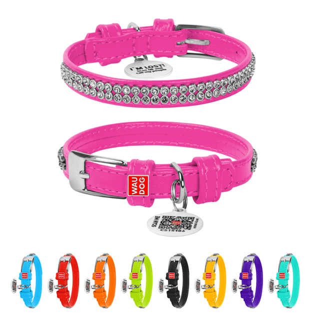 Шкіряний нашийник для собак WAUDOG Glamour з клейовими стразами і QR паспортом Ш 9 мм Д 18-21 см Pink (32507)