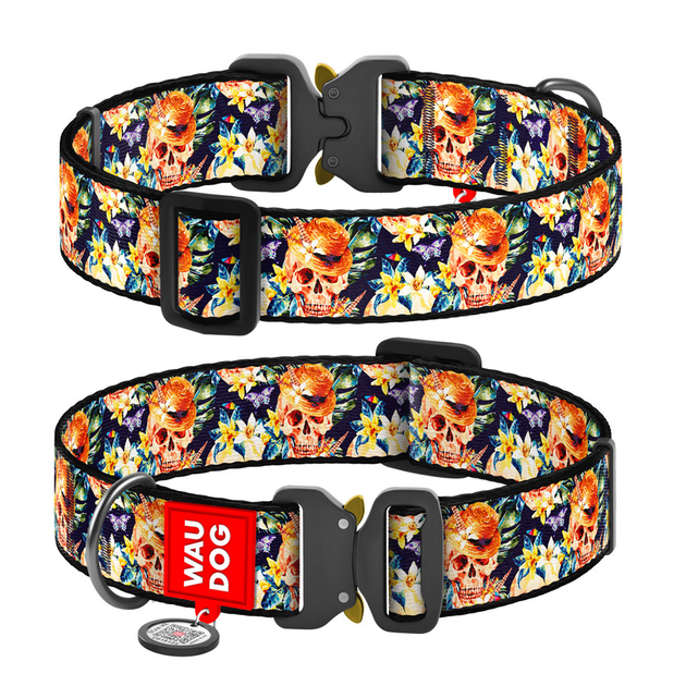 Нашийник для собак нейлоновий WAUDOG Nylon з QR паспортом, малюнок "Гламурні черепи", металева пряжка-фастекс,