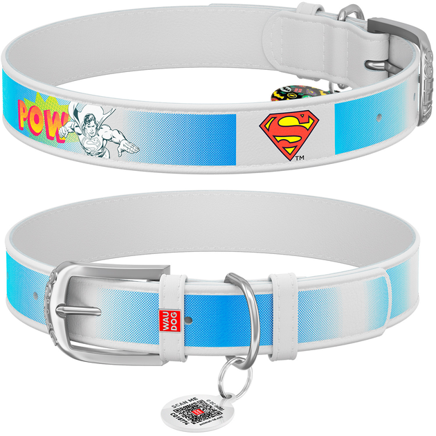 Шкіряний нашийник для собак WAUDOG Design з QR паспортом, малюнок "Супермен2", металева пряжка Білий 38-49 см 25 мм (0025-10